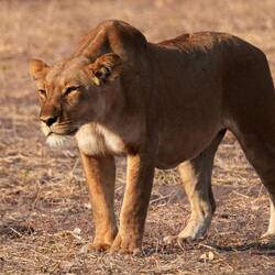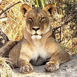 Wir fahren weiter und sehen den vermeintlichen „Übeltäter“, eine ausgewachsene Löwin auf einem Termitenhügel liegen. Wie alle Löwen schenkt sie uns keinerlei Aufmerksamkeit.