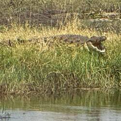 heute wollen wir ein großes Krokodil mit geöffneten Maul am Ufer liegen sehen.