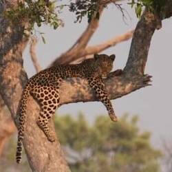 Es wird dunkel. Alex leuchtet alles aus und entdeckt in einem Baum zwei Leoparden Augen. Wir fahren hin. Alex beleuchtet ihn mit rotem Licht aus einer Taschenlampe, welches der Leopard nicht sehen kann. Nach einer Weile entdeckt der Leopard etwas im Weiten, richtet sich auf und klettert vom Baum runter. Wir verfolgen ihn ein wenig und beobachten ihn, wie er sich anschleicht. Wir lassen ihn dann in Ruhe und fahren heim.