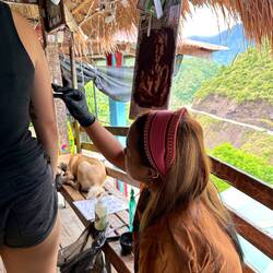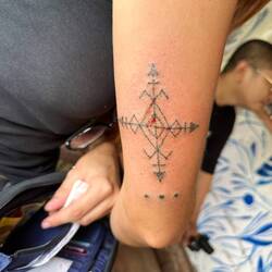 🇨🇭: okay wie cool isch da bitte gsi. Es Tattoo gstoche becho vode ältiste Tättowiererin vode Welt, zudem au no die Stylist. Sie isch 106 johre alt und macht immer no die traditionelle Tattoos. Wo mir im Dorf acho sind hemmer direkt üsu nodle derfe ussurche und mit dere het sie üs den s‘tattoo gstoche. Nodle isch ehn Dorn vonere Pflanze wo an nem Bambus stock befestigt worde isch🎋