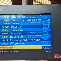 11:46 Uhr: Der leicht verspätete TER 839161 bringt mich von Sarrebourg nach Strasbourg. Dort geht es zunächst nicht weiter. Supprimé... heißt es nur lapidar zu meinem geplanten TER-Anschlusszug nach Offenburg. Ob das einem Streik geschuldet ist oder andere Ursachen hat, bleibt offen. Zugausfall...damit ist mein ICE-Anschluss mit Fahrradreservierung weg. Zum Glück finde ich im zwei Stunden später verkehrenden ICE noch eine Reservierungsmöglichkeit.