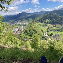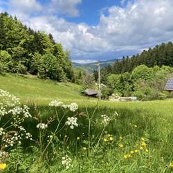 Zu Fuß gehts wieder nach Rodt zum Bahnhof. Der Zug war natürlich seit einer Viertelstunde weg. Also warten. In Schiltach bin ich um viertel vor 11. Ein schöner Ort, nur leider keine Zeit fürs Sightseeing. Von hier gehr es erst einmal 4 km steil den Berg rauf. Auf der Heuwiese belohne ich mich mit einer Johannisbeerschorle. Die Hütte hat geschlossen, aber im Kühlschrank und der kleinen SB-Bar gibt es Getränke, Kaffee, Kuchen, geräucherte Bratwurst mit Brot und sogar Wurstsalat! Heisse Rotwurst kann man auf Zuruf haben. Gute Idee!
