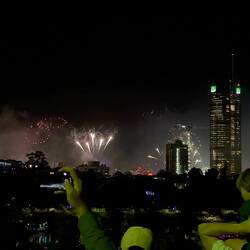 Waren heute mit Scotty und paar Freunden beim Riverfire. Da fliegt ein Jet durch die Stadt und danach gibt’s ein Feuerwerk.