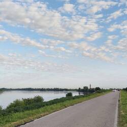 Heute gings wieder um 6 Uhr los. Die letzten Regentropfen hatten den Boden erreicht und so konnte ich trockenen Hauptes losstrampeln. Es waren kühle Temps an diesem Morgen, ja fast ein wenig kalt. Nach 7km gabs Frühstück und dann wars vorbei mit Adriaküste. In Ravenna hatte ich oder Komoot die Strecke bei der Planung wohl zuwenig genau angeschaut. Der Weg führte entlang Industriezonen und Raffinerieanlagen mit dem entsprechenden Verkehrsaufkommen morgens wenns zur Arbeit geht. Auch die 40Tönner durften nicht fehlen. Und wo Schwerverkehr fährt, da sind die Strassen in einem katastrophalen Zustand. Also hiess es für Moll höchste Konzentration. Erst als die letzte Raffinerie hinter mir lag, wurde es ruhiger. Dann radelte Moll dem Naturreservat-See Valli di Comacchio entlang und sah dabei Flamingos. Hatte ich glaube ich auch noch nie in der Natur gesehen. Weiter ging es nördlich bis Massenzatica, wo ich dann auf den Fluss Po traf.