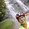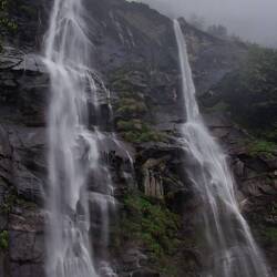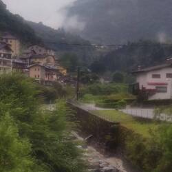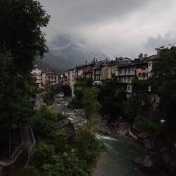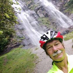 Heute um 6, als ich losradelte, regnete es am Comersee, wobei auch Donner zu hören waren. Papa Moll hatte sich -für den Oberkörper- nur die Regenjacke angezogen. Ich sagte mir, mit dem Trikot darunter, wird dieses ja eh in kürze nass. So lag die Regenjacke auf der nackten Haut und es dauerte nicht lange, bis der Schweiss aus den Ärmeln tropfte. Bis Chiavenna lief es an diesem Sonntagmorgen gut, da Moll das Navi nicht benutzte sondern stattdessen auf der Hauptstrasse blieb. Es hätte auch hier Abschnitte gegeben, welche einen Radweg gefolgt wären, aber darauf hatte ich an diesem Morgen und mit Regen keine Lust. Einen Wasserfall musste ich mir trotz früher Stunde dann aber schon anschauen. In Chiavenna gab in einer Bar das übliche italienische Frühstück. Ab Chiavenna ging es dann bergauf und schon bald war der Zoll erreicht. Ohne Kontrolle gings nun bergwärts immer weiter Richtung St. Moritz.. Am Schluss radelte Moll in einen Talkessel hinein und ich fragte mich, wo es hier lang gehen soll.