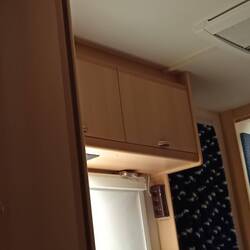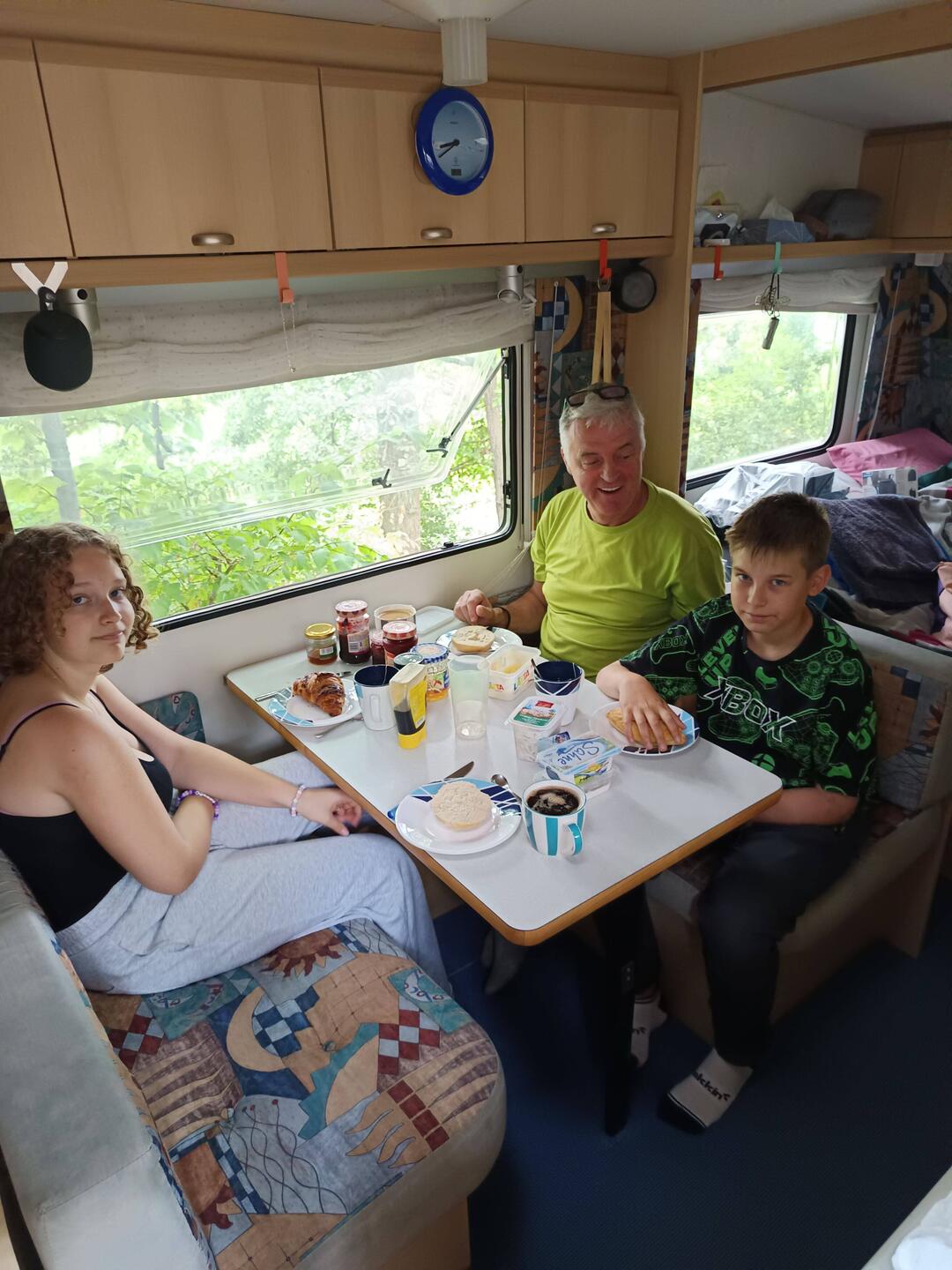 Da wir draußen weder Vorzelt, Teppich, Tisch noch Stühle hatten, aßen wir im Wohnwagen Frühstück. Schon bequem, da man alles aus seiner Position am Tisch erreichen kann, was man auf dem TischLeggi altro