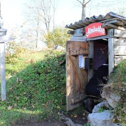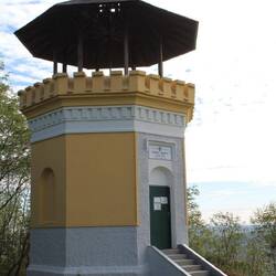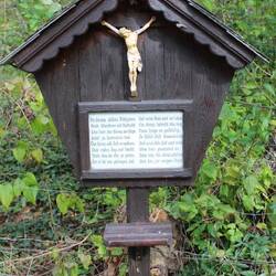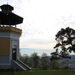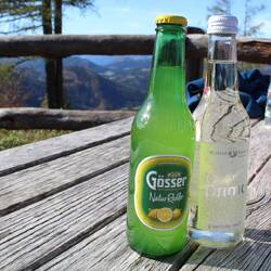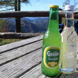 Mit Selbstbedienungsschänke am Panoramaausblick des Gipfelkreuzes am Maiszinken, 1075m