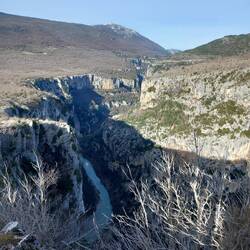 Les gorges du Verdon en voiture = vues d'en haut. Jusqu'à 1100 mètres d'attitude. Vue aussi sur les Alpes enneigées.