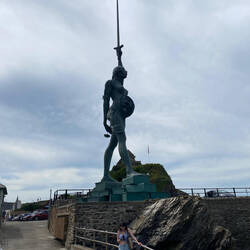 Erwähnenswert ist auf jeden Fall die umstrittene Bronzeskulptur des britischen Künstlers Damien Hurst. Die Variety, die seit 2012 die Hafeneinfahrt überragt, zeigt eine schwangere Frau mit erhobenem Schwert und offenem Bauch, in dem Fötus und Orange zu sehen ist. Das Feuilleton reichte bis nach Deutschland. In der Süddeutschen mockierte der Autor sich darüber, dass Damien Hurst das Sinnbild für die aktuelle Kunstszene in England ist und nicht gerade die Epoche prägt. Puhhh, wir können das auf jeden Fall nicht einschätzen, aber auffällig ist das Ding auf jeden Fall. Benni weiß nur noch, dass die Exfrau von Hurst in eine riesigen Villa gleich neben dem Grampus wohnt.