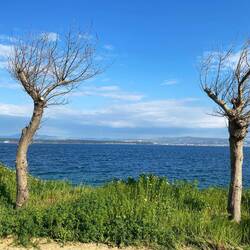 Wir sind heute bei strahlendem Sonnenschein mit den Rädern in die Stadt Ouranoupoli gefahren. Von dort zur Grenze der Mönchsrepublik Athos.