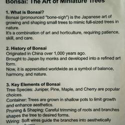 Bonsai is the Japanese art of growing and shaping miniature trees in containers, with a long documented history of influences and native Japanese development over a thousand years, and with unique aesthetics, cultural history, and terminology derived from its evolution in Japan.
