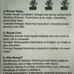 Bonsai is the art of growing ornamental, artificially dwarfed varieties of trees and shrubs in pots.