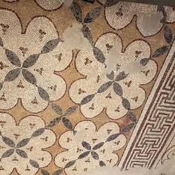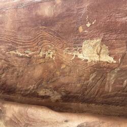 THE WALL PAINTINGS: These fragments are from a larger painting, most of which was lost through time. It was discovered in a room containing a burial chamber, within a complex overlooking a rock face, but the function is difficult to fathom. The forms may be considered abstract as we cannot explain them. They were painted on the plaster that covered the interior of the room, using red pigment extracted from iron ore veins local to the Petra region.