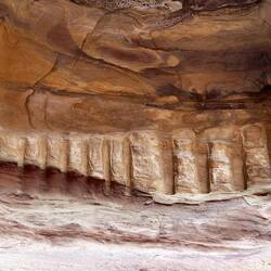 The attributes of temple/tomb monuments, and their location and setting clearly express the Outstanding Universal Value. The natural decay of the sandstone architecture threatens the authenticity of the property in the long-term. Stabilization of freestanding monuments including the Qasr al Bint temple and the vaulted structure supporting the Byzantine forecourt to the Urn Tomb Church was carried out prior to inscription.