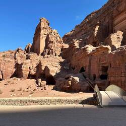 The theater is striking in that it is hewn directly from the rock in one piece. It seems the Nabataeans were in such great need of an assembly area that they had to destroy some facades that were there before, as the cliff face preserves the remains of earlier tomb complexes that had been carved away to create the auditorium’s rear wall. In the absence of documentation, we ca only guess the many kinds of events that may have been held there.