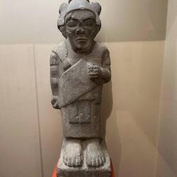STATUE OF AN AMMONITE KING: The statue carved of hard gray stone. The pose is right arm by the side with fist clenched, left arm across the stomach also with fist clenched. He is wearing a shawl over a garment in the Aramaic-Syrian tradition. His legs are close together and he is standing on a stone pedestal that was formed of the same stone. There is no inscription on the pedestal but the man is wearing Egyptian style of ate crown, symbol of kings and gods. The formal pose, dress, and crown indicate that this statue is of a king or of a god. The unmarked pupils on this statue perhaps suggest the sleep of death of a deified king.Les mer