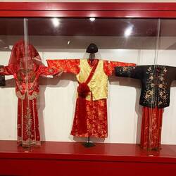 Handmade Cotton, Indigo, Wool. Blue & Red Applique Inside the Bottom of the Gown Indicates a Desire to have Children. Costume, 1980