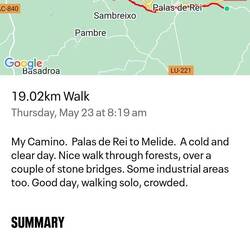 My Camino Frances 2024TravelerMelide May 23–24, 2024 in Spain ⋅ ☁️ 15 °C Palas de Rei to Melide.A cold but nice day. Not that crowded starting out from my accommodation as it was just out of town. I found a nice gluten free restaurant in Melide and had lunch and dinner there. Grilled scallops, beef hamburger. Very nice.19km walkRead more0 likes Trip