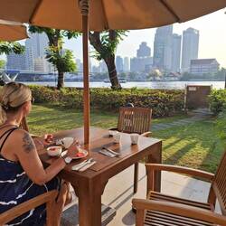 Heute Morgen haben wir erstmal ausgiebig gefrühstückt. Ich liebe diesen Blick auf den Chao Praya. Dann war Shopping angesagt.. Erst sind wir am Morgen zum Chatuchack Werkend Markt gefahren.Læs mere