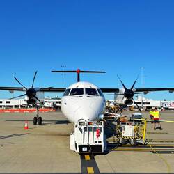 I watch the morning arrivals land on the western runway as domestic departures slowly come to life, shuttling holidaymakers and worker bees across the country. I love the number of A220s that now call Melbourne home — such a sexy plane. I’m not flying on one today though, instead taking another favourite of mine, the Dash 8, across Bass Strait to Devonport. I grab some snacks, make my way to the gate, board in Group 1 and take my seat aboard VH-84B “Winton”. This aircraft recently joined the Qantas fleet in January 2025 after a long flight from Canada following retirement from WestJet. The new QantasLink livery is still sparkling fresh on this bright sunny morning.