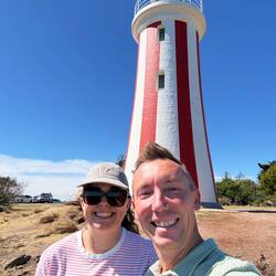 Medication sorted, plus cool drinks and a coffee for us all, we headed towards the coast for a look at something that looked cute on Google Maps – the lighthouse. Perched looking out over the north of the island, the Mersey Bluff Lighthouse stands guard with its vertical red stripes facing the ocean. While I’m busy taking photos of the lighthouse, CK is off racing down the rugged coastline, potentially to his death below.