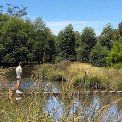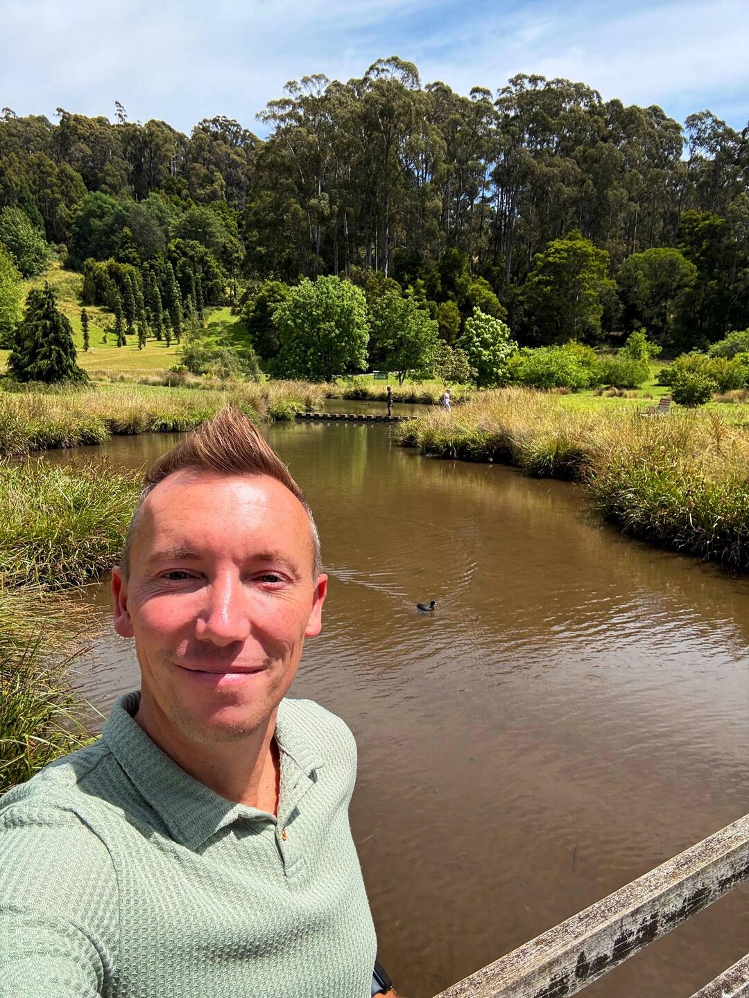 While still within earshot of Devonport, we were slowly making our way inland as our hiking trip of North West Tasmania got off to a stellar start. I proposed that we make a stop at the Tasmanian Arboretum as our next pit stop on the way. Is it because I love trees? Nope. It’s because I saw an Instagram reel of someone who swears that seeing a platypus here is guaranteed on each visit. His reel backed this up with multiple sightings, which he said took him about 15 minutes to spot. Having never seen a platypus in the wild, we were all keen to give this a shot. It was only a few minutes down the road and in the general direction of where we were going anyway, so we drove there through beautiful farmland of rolling hills for a chance to see the elusive marsupial.