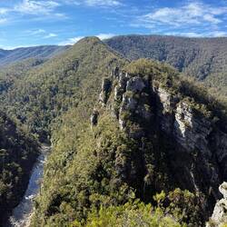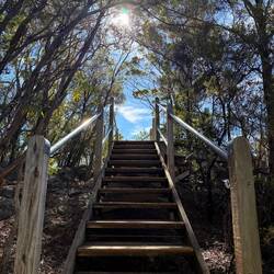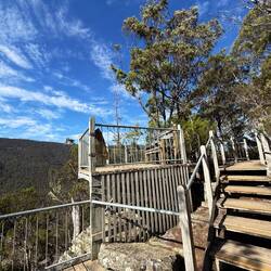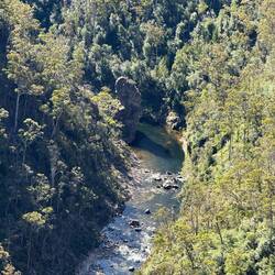 What we now know is art behind us, it was time to finish off the walk to the lookout. I bypassed all the signs telling us about… well, I’m not sure, because I didn’t read them, excited to see the view and beat the trail time. Somewhat strangely, everyone we passed on their way back from the trail were solo walkers. Were they all together, argued, and then walked back solo? Or were they all just on their own little hikes? Pondering the relationship status of these fellow walkers, 12 minutes later we were climbing up stairs to a small two-tier platform overlooking the bluff and the Mersey River below. It’s only after the last couple of steps onto the railing of the viewpoint that the strong wind blowing through the gully and up the cliffs hits you, on what is otherwise a super calm day.