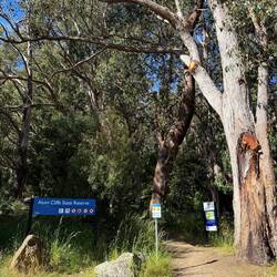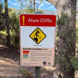 But what was this thing anyway? It kind of looked as if it was either drawing attention to whatever may have once lain at the centre, or maybe some special place for a cult ritual. Without Google, we’d never know — but fortunately we don’t live in the dark ages anymore. A quick search tells me it celebrates the confluence of Quamby Bluff, Alum Cliffs Gorge, and Western Bluff at that point. With that explanation in hand post-hike, it does explain what is going on when you get to the lookout. Nice work to the artist David Jones on using natural materials to represent the viewpoint we soon see from the lookout ahead — perhaps a sign explaining that would complement the many warning signs.