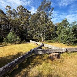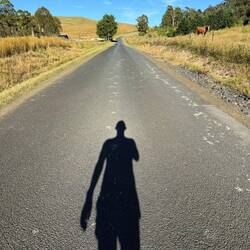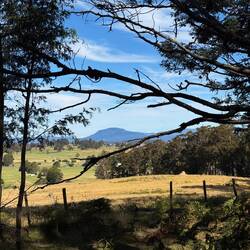 The first part of the trail was slightly uphill, with farmland on the right and bush on the left. As the farmland petered out and the bush thickened, we came across what I’m guessing is some kind of old sculpture. Three long logs of wood, each rectangular in shape and about the length of a telegraph pole, forming a smaller central triangle with the longer logs then darting off across each axis of the triangle. There wasn’t much info about it other than several signs plastered to it advising “Do not climb on structure”. Safety signs seem to be a Tassie thing — with signs advising how dangerous areas are rated from low to severe. This structure has been deemed at risk of collapse and injury should it be climbed, which to be fair is something I probably would have done if the multiple signs hadn’t told me not to.