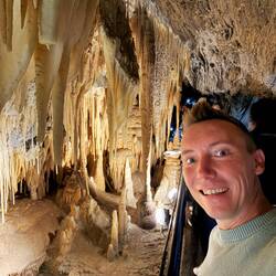 The stalactites and stalagmites produce stunning displays as we progress deeper into the cave. We’re about 120 metres beneath the surface, so as water over millions of years dissolves the limestone above, it trickles into the cave and, drop by drop, forms beautiful calcium carbonate features. “How often does each drop, drop?” asks one of the group. “Every two minutes and thirteen seconds,” the guide quickly responds. I get the feeling she may have just made that number up, as I’ve seen the stalactite in front of me drip at least twice already and we haven’t been here that long yet. Surely it depends on how much water is above, but anyway – cool fun fact.