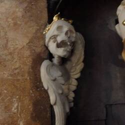 Also in the church: the Devil's Footprint. There are a few legends around this somewhat disappointing site. The most agreed upon: the Devil made a deal with the master builder-- he would see that the church was completed quickly, but there could be no windows, or the builder would lose his soul. When it was complete (remember that short twenty years), the Devil came to look, saw no windows, deal complete. However, he soon learned he had been tricked, because the windows in the nave were behind the interior columns. Too late to do anything about it as the church had been consecrated, or to reap his soul, he stamped his foot in anger, turned into a whirlwind, and tried to blow the church down. No luck. It's still there, but so is his footprint out in the foyer.