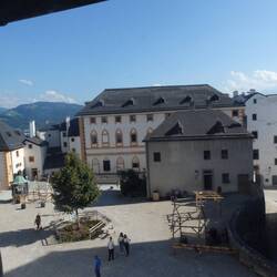 While there was a roman fort at the site, the construction of the structure there now was begun by Archbishop Gebhard von Helfenstein in 1077. It was expanded over the centuries as the Archbishops gained more wealth and power (remember that salt?). Prince Archbishop Burkhard von Weisbriach was responsible for building a number of the towers and outer walls in 1462. An early modern version of a funicular rail system, the Reisszug, was added somewhere between 1494-1505 to carry supplies up to the fortress. It's still there, and we rode on it. The version today is a lot like the lift they use at Hillbilly Golf in Gatlinburg, Tennessee, though fully enclosed. Score one for the hillbillies.