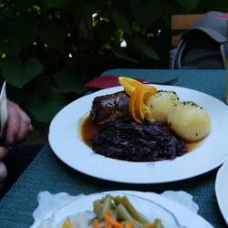 As for food, apparently it's Pfifferlingsaison! Mushroom season. So there was schnitzel with spätzle and mushroom cream sauce with a salad (ew who needs that to bring you down), and beef rouladen stuffed with speck and wild mushrooms in Gose beer sauce, Bratkartoffeln and red cabbage. A good first German meal.