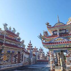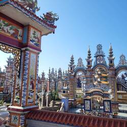 Bevor wir über Hues Countryside (ebenfalls wunderschön) schließlich in die Stadt fuhren, ging es als letzten Abstecher noch an den An Bang Cemetry, der auch City of Ghosts genannt wird. Ich hätte nie gedacht, dass ein Friedhof so ein Highlight sein kann! Die Gräber auf dem 3km²(!) großem Areal wurden und werden vornehmlich von reicheren, in die USA ausgewanderten vietnamesischen Familien erbaut - teils lange bevor die Menschen verstorben sind (viele Grabsteine sind schon beschriftet, aber ohne Todesdatum) - damit sie nach ihrem Ableben zurück in der Heimat begraben werden können. Die Gräber sind richtige Familientempel mit wunderschöner Keramikkunst - daher kostet so ein Grab auch bis zu 250.000$. Die Farbenpracht war der Wahnsinn! Wirklich super schöne Kunsthandwerke, die Keramikmosaike erzählen teils die Familiengeschichte oder repräsentieren buddhistische Symbole/Wesen. Ich hätte mir das alles ewig anschauen können.