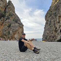 Sa Calobra selbst ist wieder so ein absoluter Insta-Spot. Hunderte Menschen in teils wilden Outfits, gefühlt 20 Cafes, ein Kieselstrand. Wir trinken noch einen Kaffee und schauen uns den Ausgang der Schlucht an. Hier wären wir raus gekommen, wenn alles geklappt hätte.