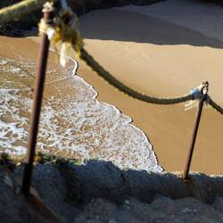 Nur leider versperrt ein mindestens hüfttiefer Fluss den Zugang zum Strand. Und die Treppe ist unmissverständlich mit rotem Flatterband abgesperrt.