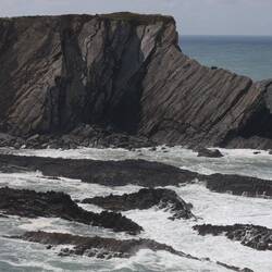 Nach knapp 8 Kilometer geht es Richtung Küste, wo wir wieder der grün-blauen Markierung des Fischerpfads folgen. Hier ein gewohnteres Bild: Küste, Klippe, Fels (und Feld).