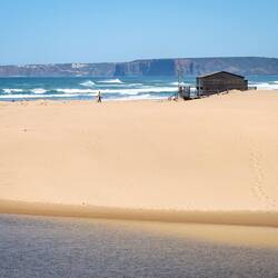 Mit offenem Mund stehen wir an der Praia de Bordeira und betrachten die riesige goldgelbe Fläche, die sich vor unserer Nase erstreckt. Im Hintergrund grün abfallende Steilküste, davor eine Lagune, viel Sand und wenige Menschen.