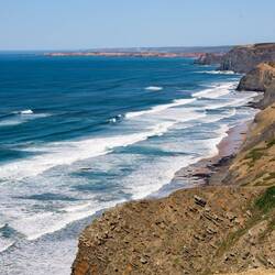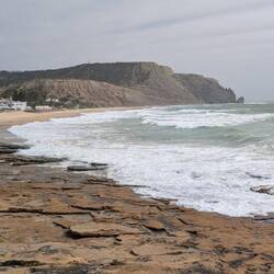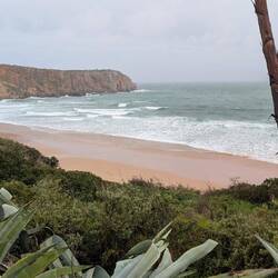 Erst beim Buchstaben "J" gönnen wir uns ein Päuschen. Neben den Überresten eines islamischen Fischerdorfs finden wir eine Bank, von der aus wir den fast ebenso traumhaften Praia de Amado im Blick haben.