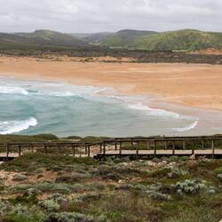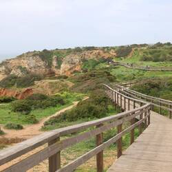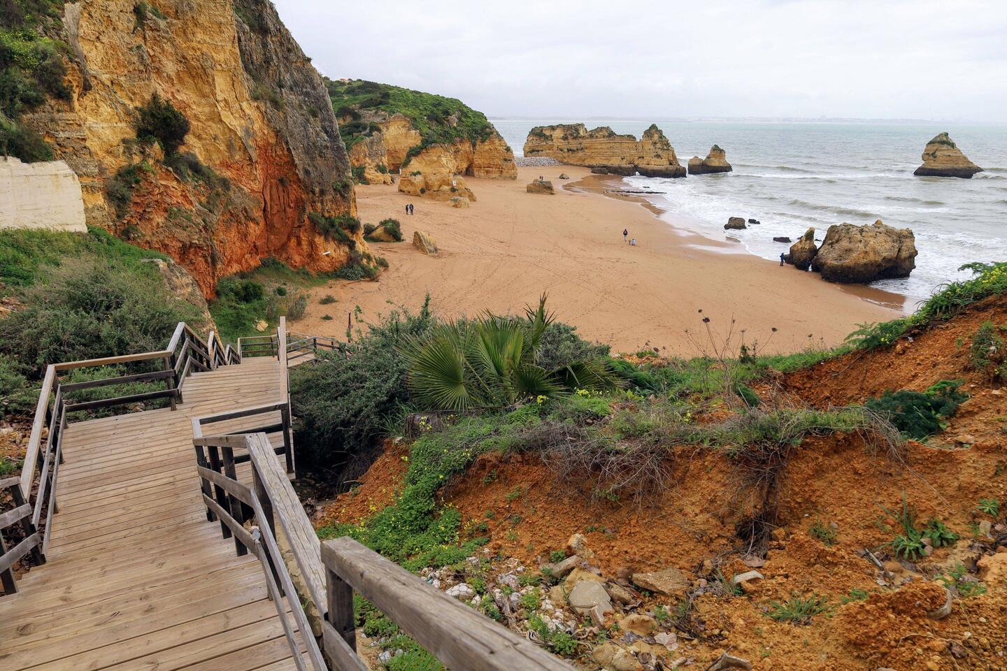 Er liegt etwas südlich von Lagos Stadtzentrum und ist im Sommer sehr beliebt. Sogar eine Buslinie und einen touristischen Zug gibt es dann. Wir finden heute aber locker noch einen Parkplatz und laufen entspannt die 93 Holzstufen runter zum goldgelben Sand.