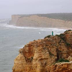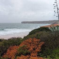 Und besuchen kurz einen weiteren Strand von Sagres. Dort stellen wir überrascht fest, dass selbst bei ungemütlichen 10 Grad Außentemperatur und Nieselregen ein Surfkurs stattfindet (Tatsächlich - spannend!).