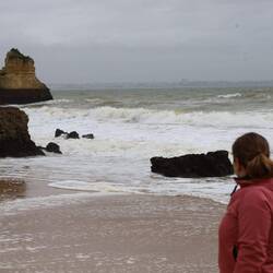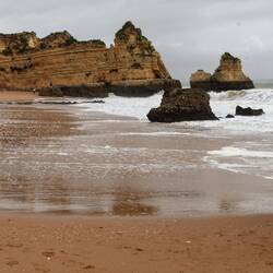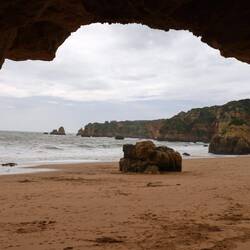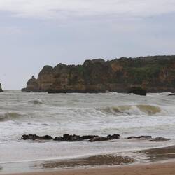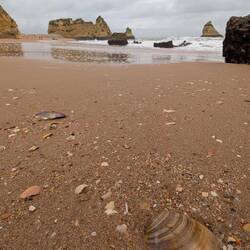 Wie auch bei der nahe gelegenen Ponta da Piedade türmen sich Klippen und hübsch anzusehende Felsformationen direkt am Strand auf. Wir schlendern etwas umher und entdecken immer neue Formen, große Muscheln und sogar eine kleine Art Höhle. Bei Ebbe könnte man richtig um die Felsen herum gehen, jetzt gerade ginge das nur mit nassen Füßen (und Hosen).