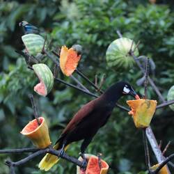Nachdem uns der Lodge-eigene Hahn (alias Montezumastirnvogel) erfolgreich aus dem Schlaf geschrien hat, schälen wir uns gemütlich aus dem Moskitonetz und machen uns genauso gemütlich über ein riesiges Frühstück her.