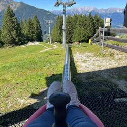 Anschließend nutzen wir die in unserer Übernachtung enthaltene Stubai Card weiter aus. Fahren noch mit einer Seilbahn den Berg hoch und via Sommerrodelbahn wieder runter. (Hier mal ohne Opa. Zuzutrauen wäre ihm aber auch das!😅)
