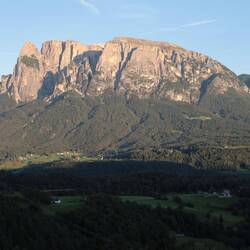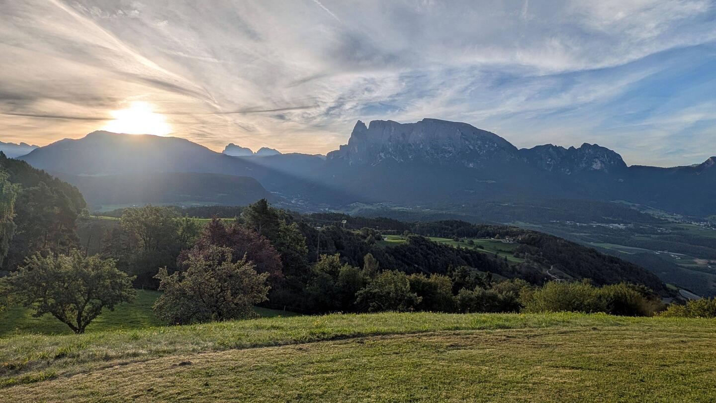Nach dem tollen Auftakt im Stubaital kommen wir am späten Nachmittag in Südtirol an - und werden direkt von der Lage unserer Unterkunft umgehauen. Der Wieserhof liegt verträumt an einem steilen Berghang und GENAU gegenüber des Schlernmassivs. Dieses leuchtet gerade im warmen Spätsommerlicht mit der Sonne um die Wette, während Bienen müßig durch den blühenden Garten summen und Vögel in den Obstbäumen herumwirbeln.