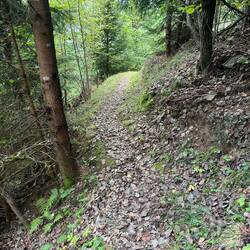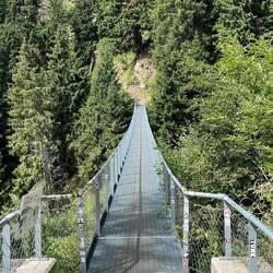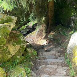 Der Pfad mit der Markierung 24 windet sich erst aussichtsreich und teils ausgesetzt am Hans-Frieden-Weg entlang, führt dann aber schon bald vorwiegend durch Wald. Damit es da nicht langweilig wird, gibt es unterwegs reichlich Einkehroptionen, eine Hängebrücke, einen Aussichtspunkt mit Gipfelkreuz, viele plätschernde Bäche uuund... besagte Stufen.