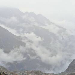 Stoisch stapfen wir also durch das Schietwetter. Der Aufstieg ist technisch leicht, gut ausgebaute Serpentinen führen aufwärts. Dies erklärt vielleicht auch, dass wir überproportional viele Mountainbiker sehen, die ihr Fahrrad den matschigen Berg hoch- und auf der anderen Seite wieder runterschieben. Der Reiz dieser Unternehmung erschließt sich mir nicht ganz - fairerweise könnte man das aber auch über uns selbst sagen. Stundenlang mit null Sicht, eisigem Wind und von vorne peitschendem Regen durch die Gegend zu latschen wirkt schon reichlich sinnbefreit, wenn man stattdessen in einer kuschelig warmen Hütte sitzen und sich mit hochkalorischen Schmankerln mästen könnte...
