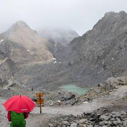 Aber wir nehmen es sportlich. Schlechtwettertage gehören für uns zu einer Hüttentour schon fast dazu - von tagelangem Dauerregen bis zum plötzlichen Wintereinbruch haben wir alles schon mal gehabt. 🌪️🌧️🌡️☀️🌩️☃️ Und immerhin ist der Rucksack schön leicht, wenn fast jedes einzelne Kleidungsstück am Körper klebt. Zudem können wir uns in allgemeiner Bewunderung sonnen, weil wir die einzigen sind, die gleich zwei große, stabile Regenschirme dabei haben. Aber alles nur Erfahrungswerte, kein Ausdruck besonderer Intelligenz...🤓