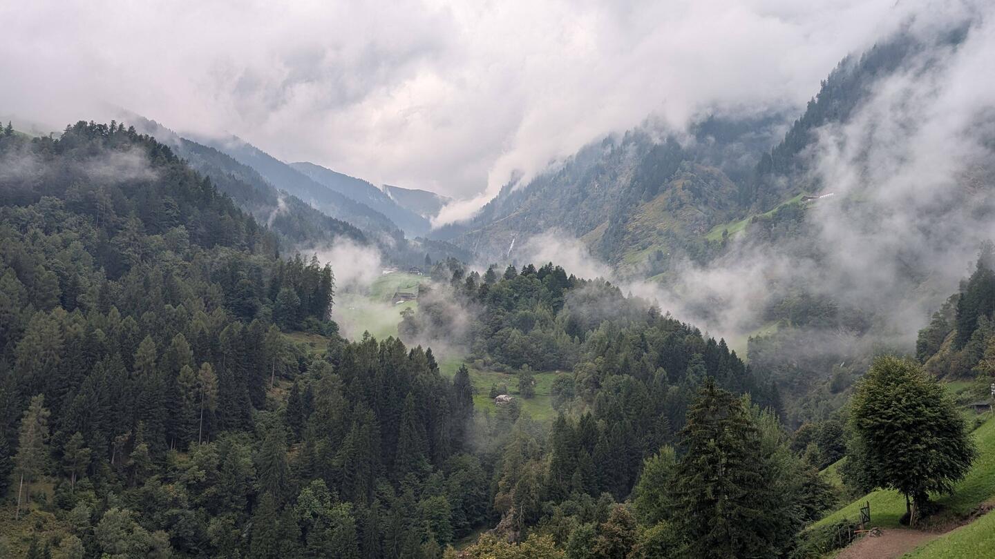 Auch heute ist wieder alles dabei: Regen, Nebel, später Sonnenschein. Waldsteige, Forstwege, Waalwege, Wiesen, Wasserfälle, Asphalt, Aussichtspunkte, Höfe, Obstplantagen, tierische Begegnungen, menschliche Shoppingstände. Und sogar Bänke.👍🏼😀