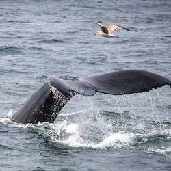 Die meisten bleiben nur ein paar Sekunden, um direkt Fluken-schlagend für den nächsten Happen abzutauchen. Einige ruhen sich aber noch kurz an der Wasseroberfläche aus, und einer winkt uns sogar scheinbar mit seiner Flosse zu.